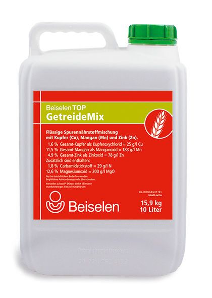 Bei BeiselenTOP GetreideMix handelt es sich um eine speziell auf die Kultur abgestimmte blattaktive Spurennährstoffmischung, die durch eine optimierte Formulierung als Suspension einen hohen Ausnutzungsgrad aufweist. Dies ist vor allem wichtig wenn die Boden-Nachlieferung vermindert ist.